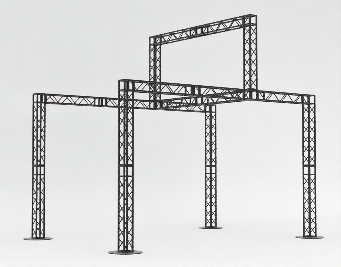 Данная конструкция представляет собой пространственную раму на четырех опорах с возвышающейся центральной секцией («короной»). Такое решение позволяет не только зонировать пространство, но и создавать визуальный акцент на объекте, расположенном внутри или под верхней аркой.