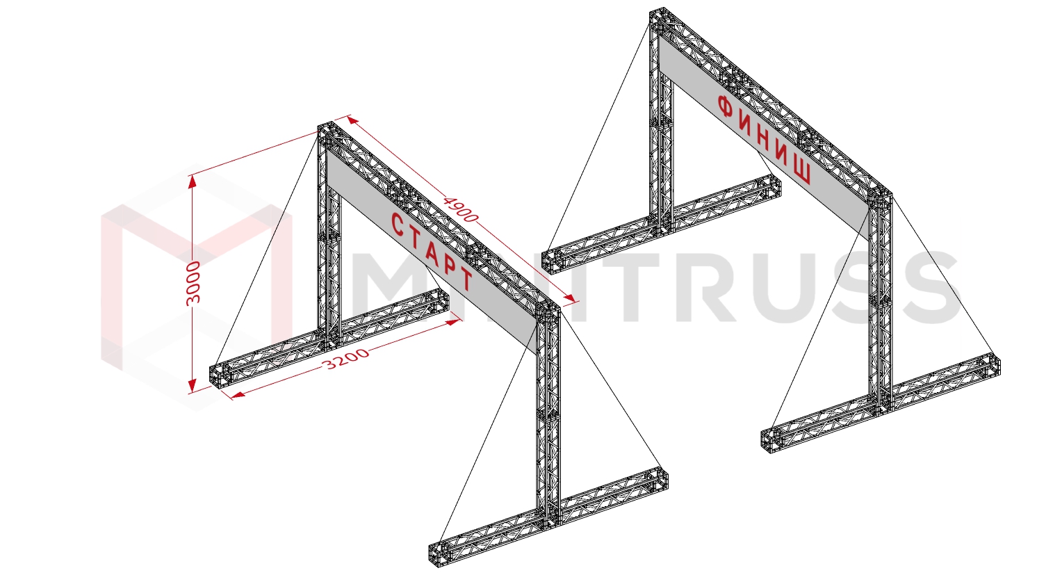 Этот набор из двух идентичных Т-образных арок серии MINITRUSS специально разработан для организации спортивных и массовых событий. Благодаря увеличенному основанию (3200 мм) и системе тросовых растяжек, конструкции обладают повышенной устойчивостью к опрокидыванию, что критически важно при установке на открытом воздухе.