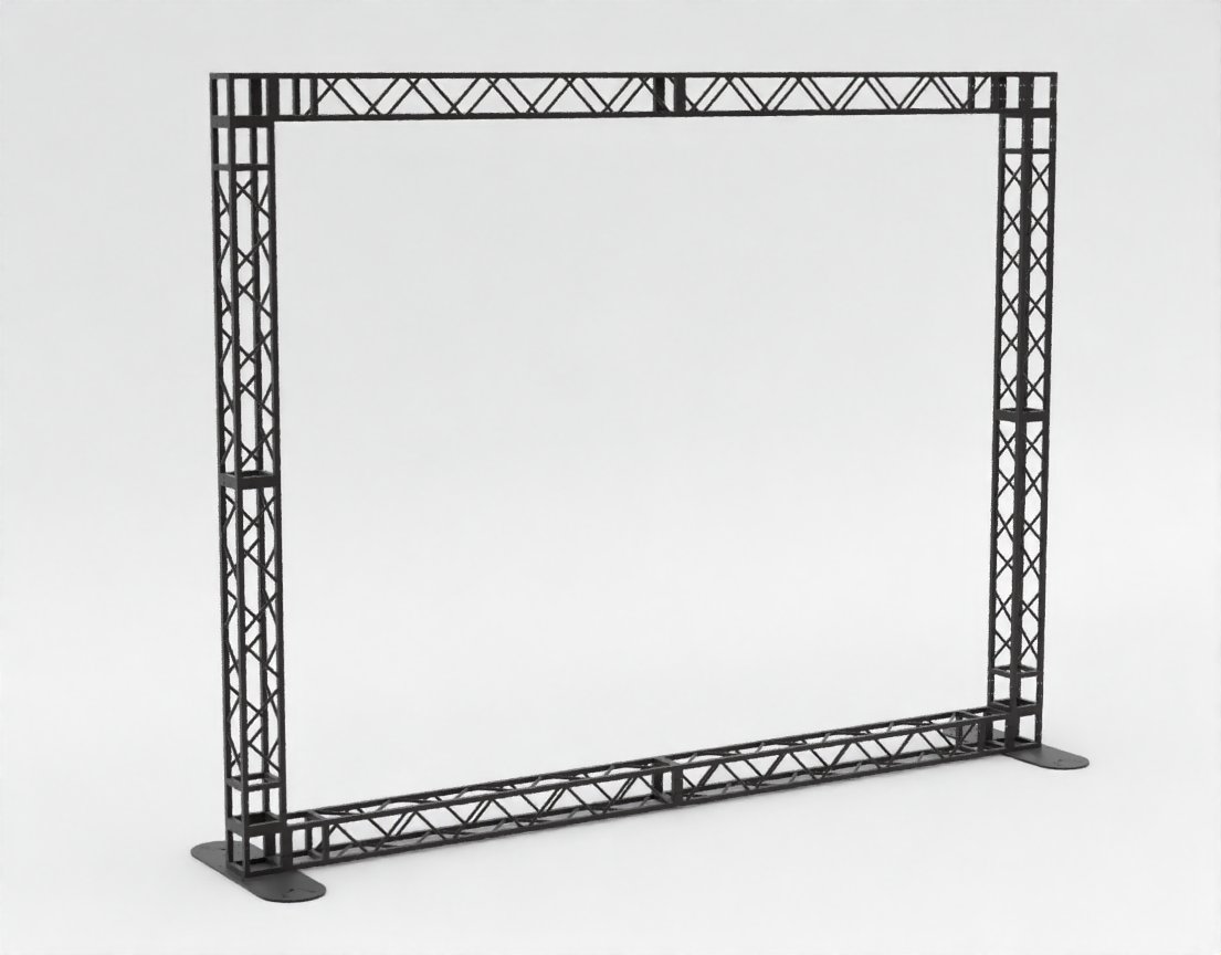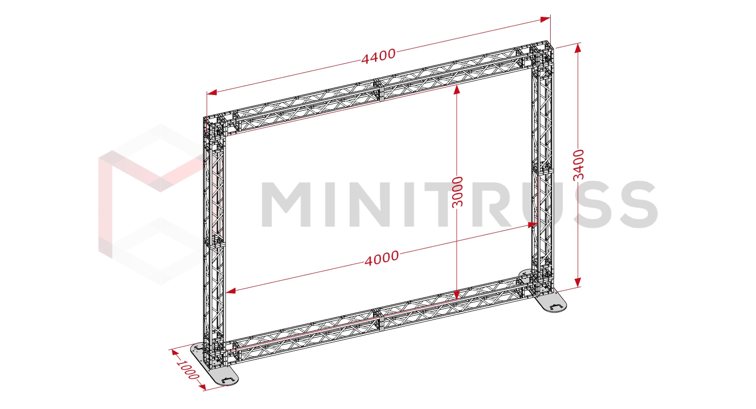Эта конструкция является самой высокой в линейке рам на базе серии MINITRUSS. При общей высоте 3,4 метра и ширине 4,4 метра, она обеспечивает колоссальную площадь для брендирования, позволяя создать полноценную временную стену или огромный экран для мультимедийного контента.