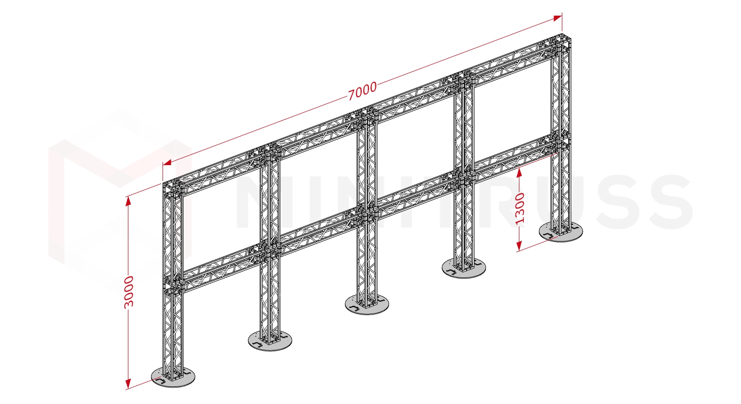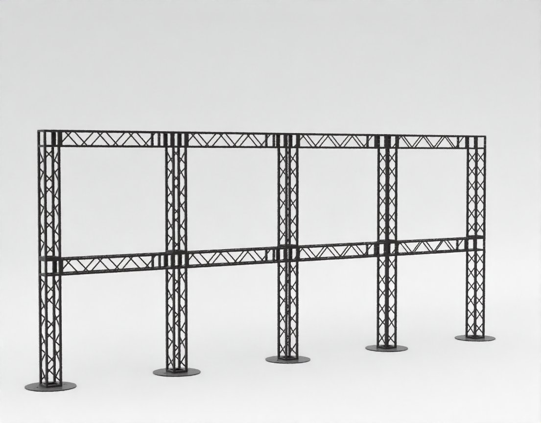 Эта модель является рекордсменом серии MINITRUSS по длине среди линейных конструкций. Семиметровый пролет, разделенный на четыре секции пятью вертикальными опорами, обеспечивает исключительную жесткость и позволяет создать единую визуальную линию на огромном расстоянии. Благодаря промежуточным стойкам, конструкция сохраняет идеальную геометрию даже при существенных нагрузках.