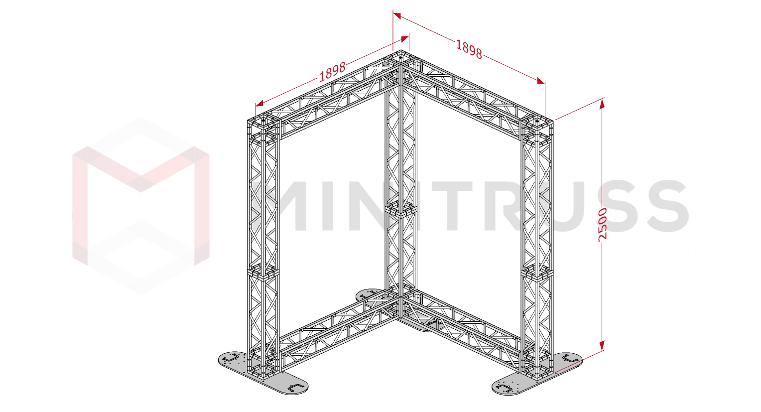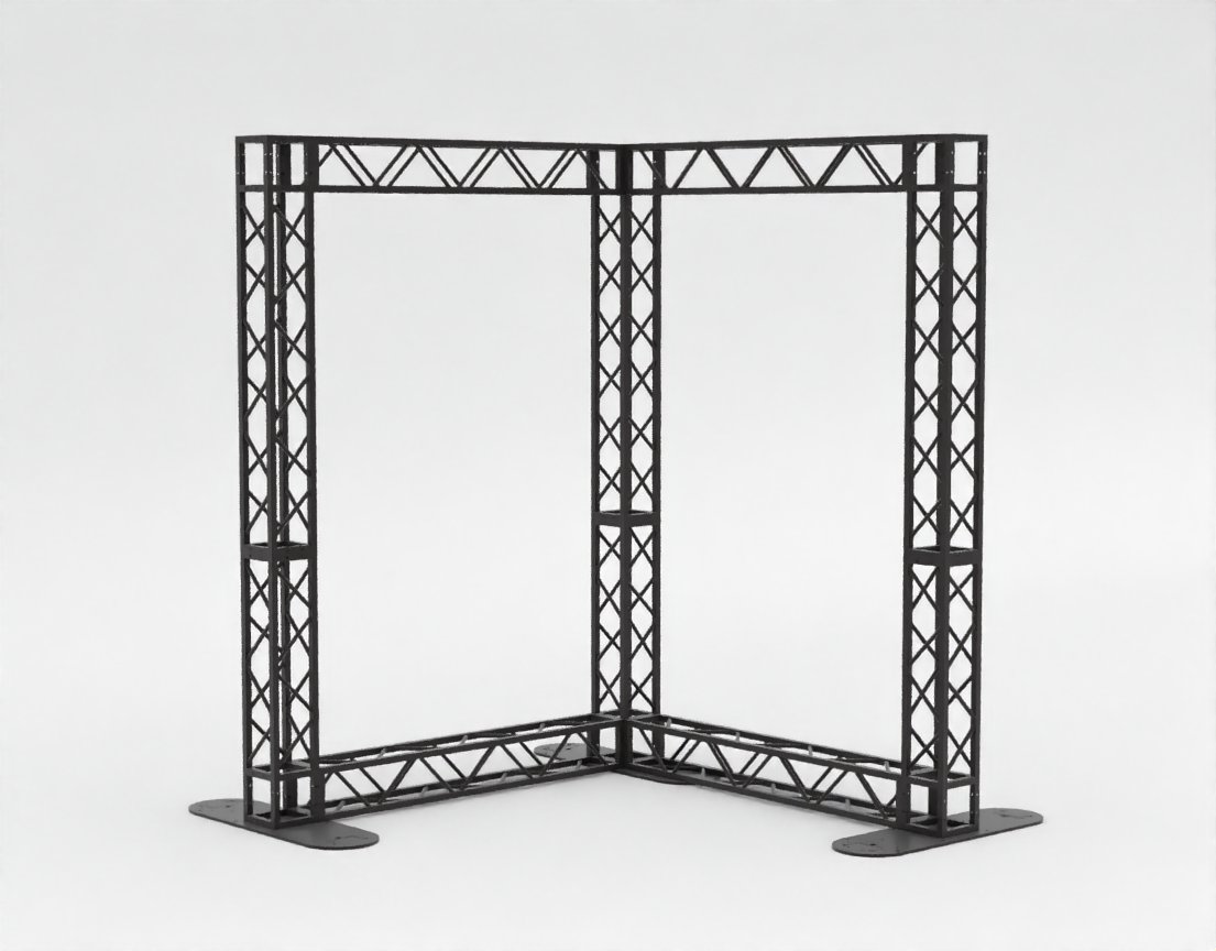 Эта Г-образная конструкция серии MINITRUSS — идеальное решение для создания компактных, но заметных информационных или имиджевых зон. Благодаря угловой форме, стенд обладает повышенной устойчивостью и позволяет эффективно использовать пространство на стыке двух стен или в углах выставочных залов. Высота 2,5 метра делает его соразмерным интерьеру, сохраняя при этом профессиональный технический вид.