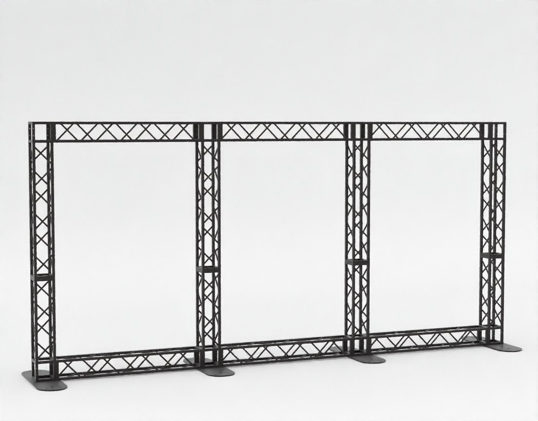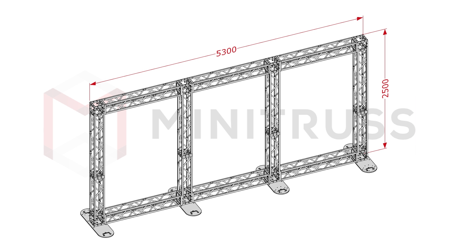 Данная модель представляет собой протяженную стальную конструкцию серии MINITRUSS, состоящую из трех последовательных секций. При общей длине 5,3 метра и высоте 2,5 метра она является идеальным балансом между масштабностью и компактностью опорных элементов. Четыре вертикальные стойки с плоскими основаниями обеспечивают равномерное распределение веса и исключительную устойчивость всей системы.