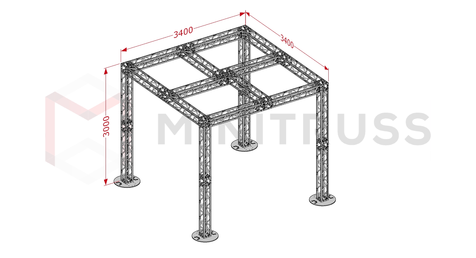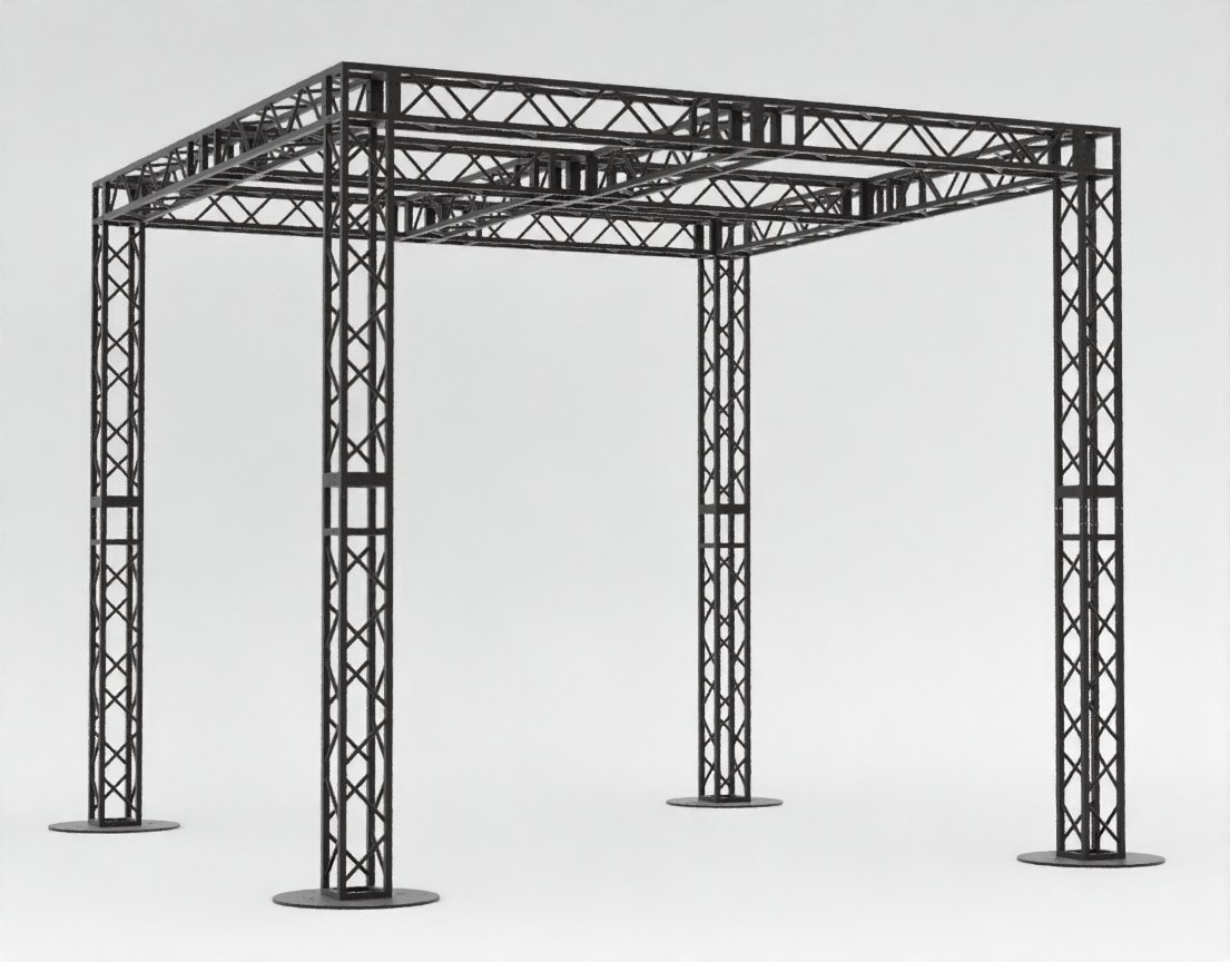 Данная модель представляет собой объемную пространственную конструкцию серии MINITRUSS, выполненную в форме правильного куба с дополнительным центральным усилением. При габаритах 3,4 х 3,4 метра и высоте 3 метра система обеспечивает внушительный полезный объем, сохраняя при этом визуальную легкость стального каркаса. Четыре вертикальные стойки на массивных круглых основаниях гарантируют безупречную устойчивость и позволяют размещать оборудование по всему периметру и центру верхней рамы.