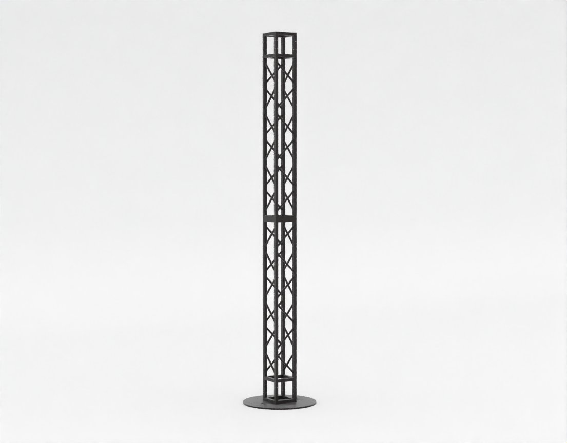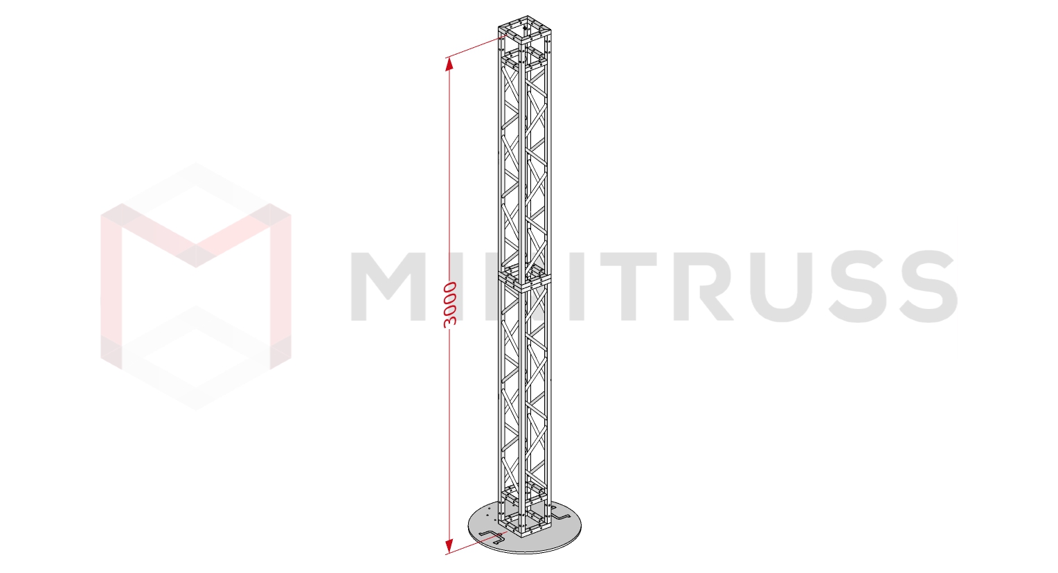 Данная модель представляет собой вертикальную стальную конструкцию серии MINITRUSS, спроектированную как самостоятельный опорный элемент или независимая рекламная стела. При высоте 3 метра стойка занимает минимум места на полу, обеспечивая при этом полноценную вертикальную доминанту для размещения оборудования или визуальной информации. Массивное круглое основание гарантирует устойчивость конструкции без необходимости дополнительного крепления к стенам.