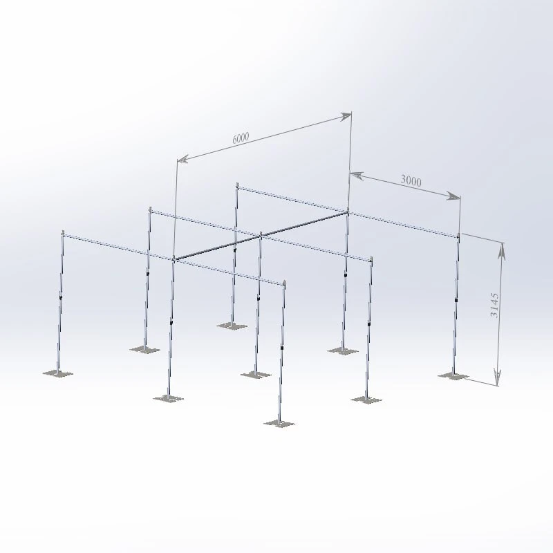 Система основывается на использовании регулируемых телескопических вертикальных стоек, поддерживаемых стальными основаниями, и регулируемыми телескопическими или фиксированными горизонтальными ригилями, которые образуют раму для для тканевой драпировки.