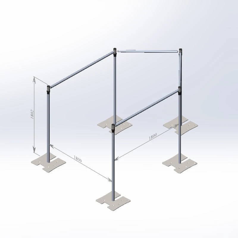 Система основывается на использовании регулируемых телескопических вертикальных стоек, поддерживаемых стальными основаниями, и регулируемыми телескопическими или фиксированными горизонтальными ригилями, которые образуют раму для для тканевой драпировки.
