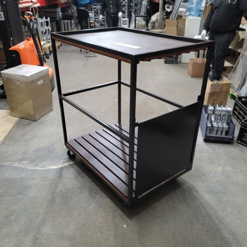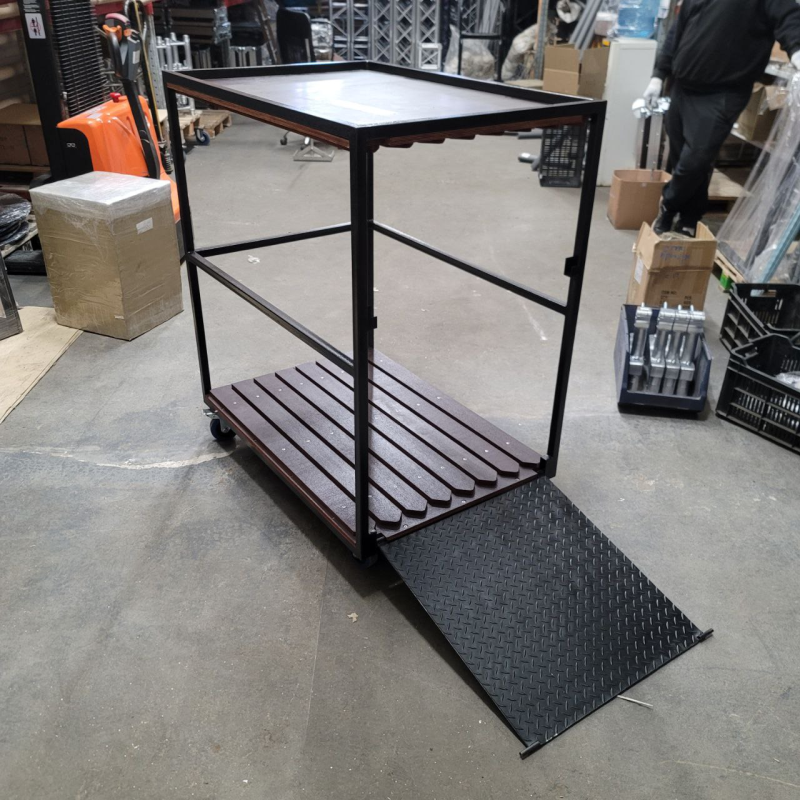 Материал: труба стальная 25х25х2 мм, фанера ламинированная 15 мм, колесо полиуретановое поворотное с тормозом 4 шт диаметр 100-125 мм.